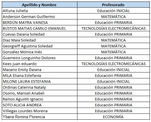 | DNI | APELLIDO | NOMBRE | PROFESORADO |